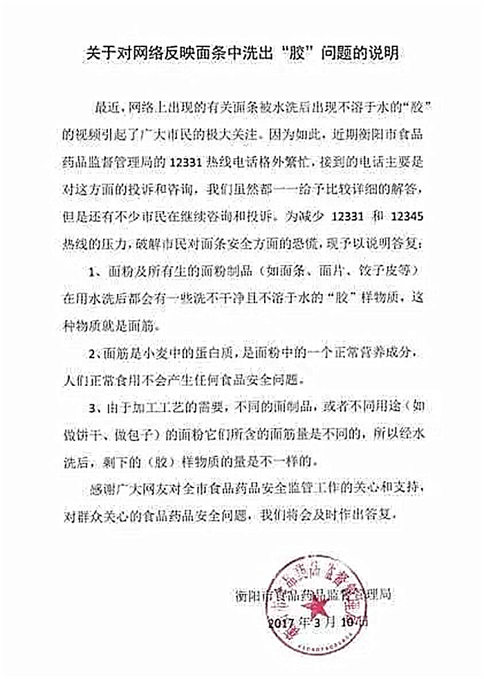 然而事实并非如此,“剧情”很快出现反转,随后各地专家和电视台,以及食品药品监督局纷纷站出来通过各种渠道进行辟谣说明,面条中被人误解的“胶”状物,实为“面筋——小麦中的蛋白质”,是面粉中的正常营养成分。