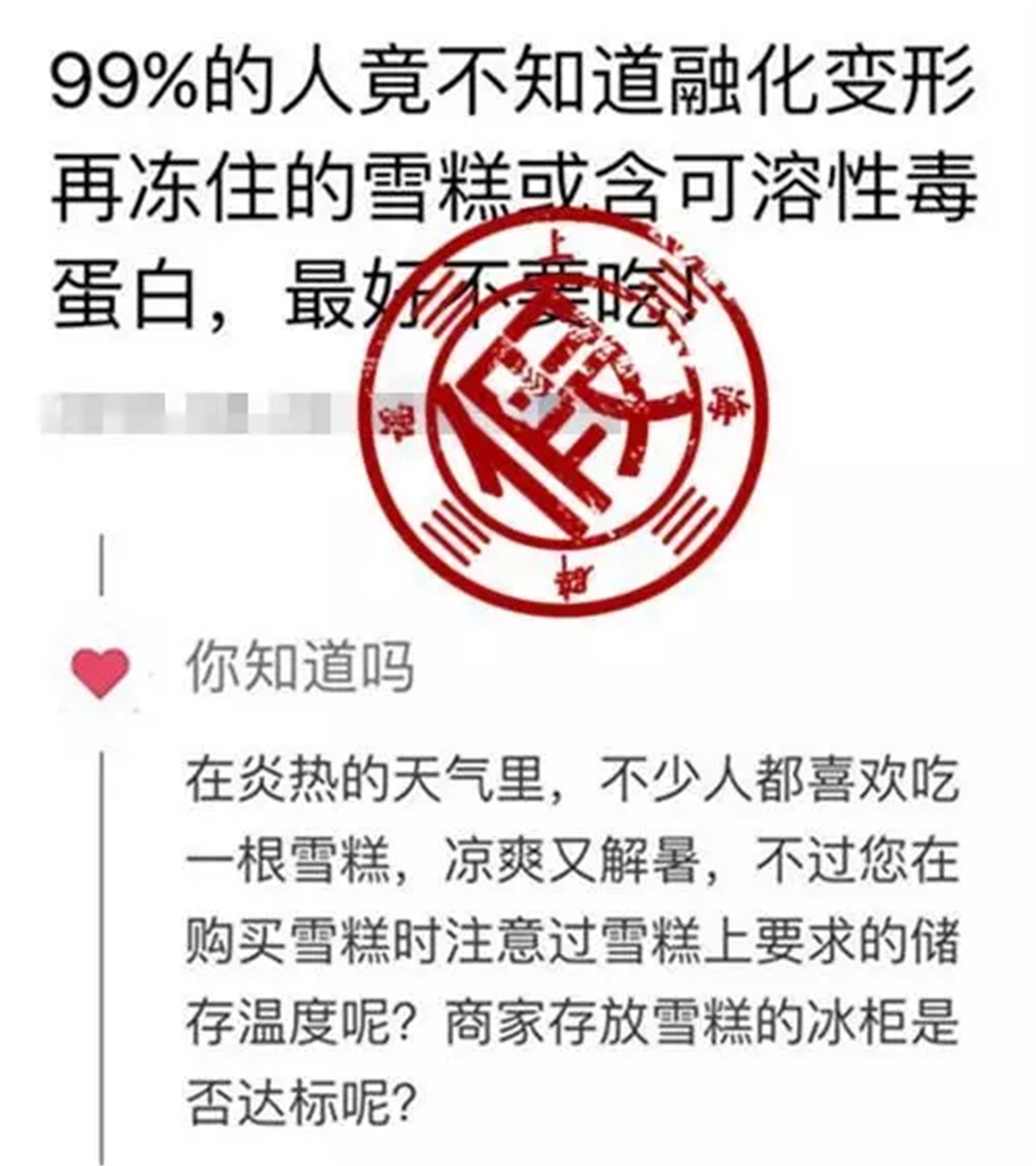 近日,一篇名为《99%的人不知道:融化变形再冻住的雪糕或含可溶性毒蛋白!》帖子在朋友圈流传。网帖称,如果雪糕或冰淇淋达不到要求的储存温度,就会引起一些结构的变化。有些雪糕经过融化以后再重新冻住,就会产生一些对身体有害的物质,如可溶性毒蛋白及胺类等。