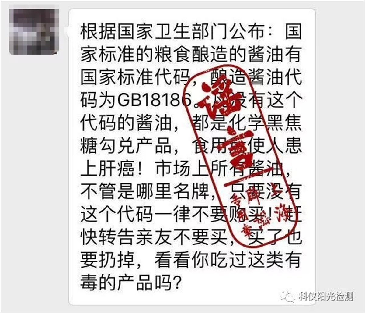 近日,一则“酱油致癌”的消息在网上不胫而走。消息称:“根据国家卫生部门公布:国家标准的粮食酿造的酱油有国家标准代码,酿造酱油代码为GB18186。凡没有这个代码的酱油,都是化学黑焦糖勾兑产品,食用后使人患上肝癌!市场上所有酱油,不管是哪里名牌,只要没有这个代码一律不要购买!赶快转告亲友不要买,买了也要扔掉,看看你吃过这类有毒的产品吗?”