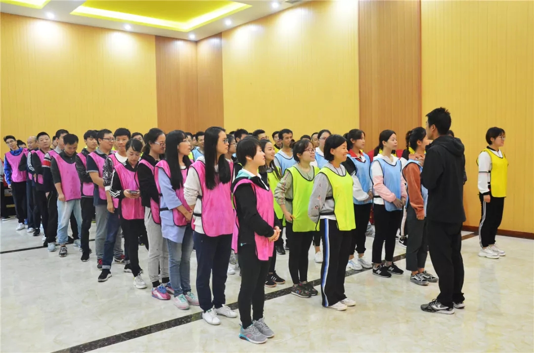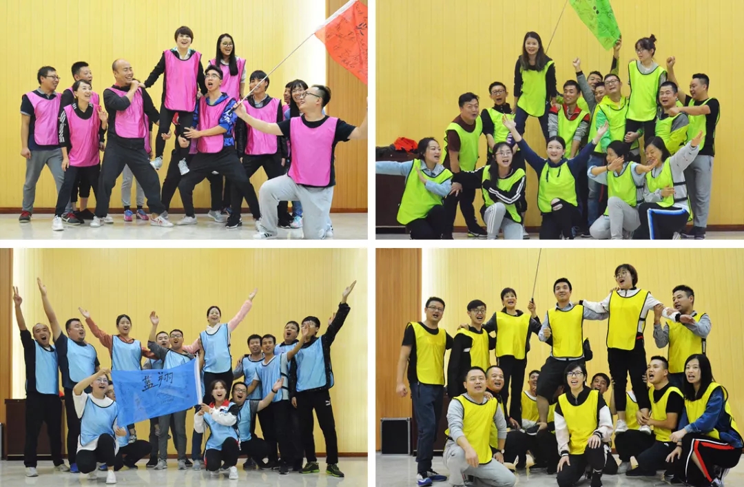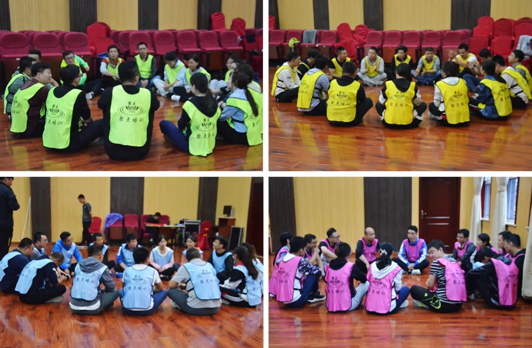 首先在教练的指示下,全体人员分成四个小组,需要在规定的时间内选出各队的队长、副队长、旗手、安全员等,并设计队名、队旗和口号,计时开始,各队纷纷开始了讨论,在队长的带领下,团队成员们积极献策,从队名、队旗、队歌、队形的展示,开动脑筋,反复演练。尽管时间短暂,但每个队都给出了优异的答案。(红队—尖刀队,绿队—狂魔队,蓝队—蓝翔队,黄队—黄袍队,下文将以各队队名代替一、二、三、四队。)