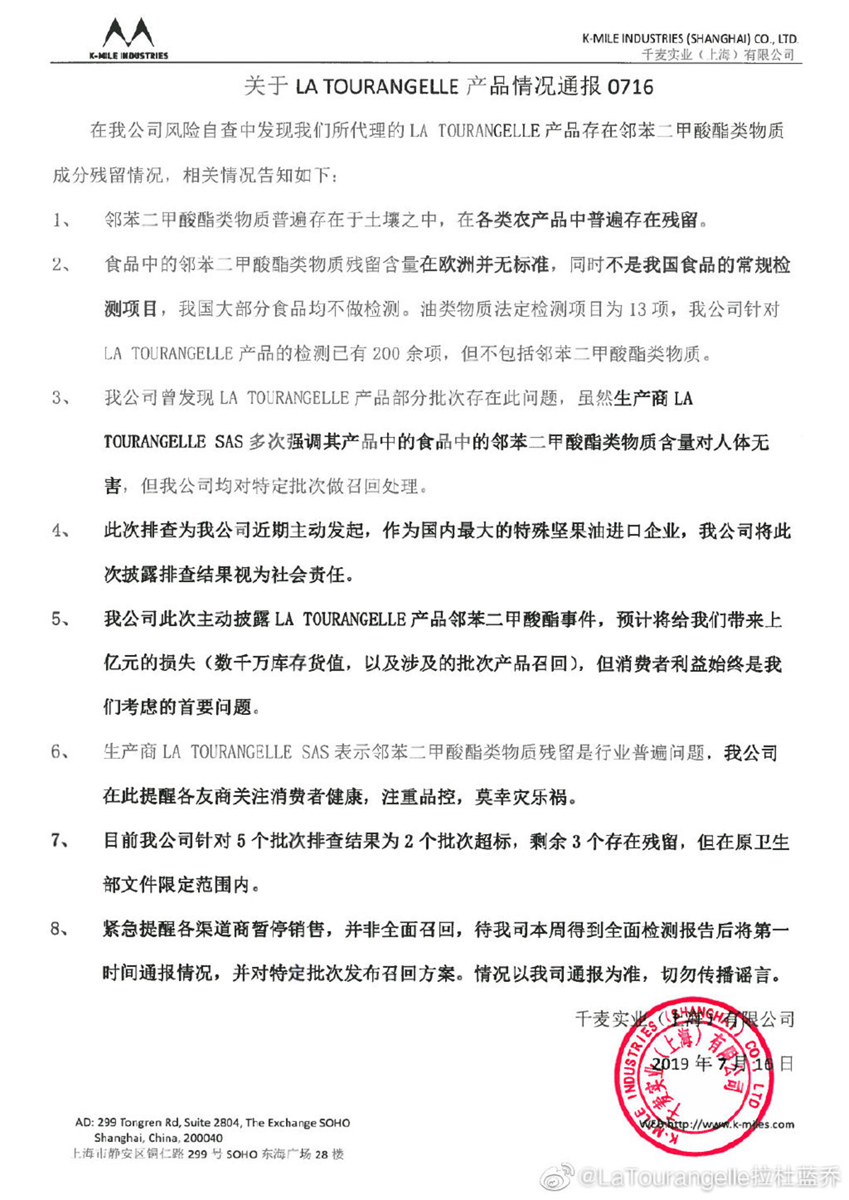 事件起源于7月16日法国LaTourangelle的中国进口商-千麦实业在其官方微博发布的头条文章,文章声称,在公司产品风险自查中发现其所代理的拉杜蓝乔产品中存在邻苯二甲酸酯类物质成分残留情况。