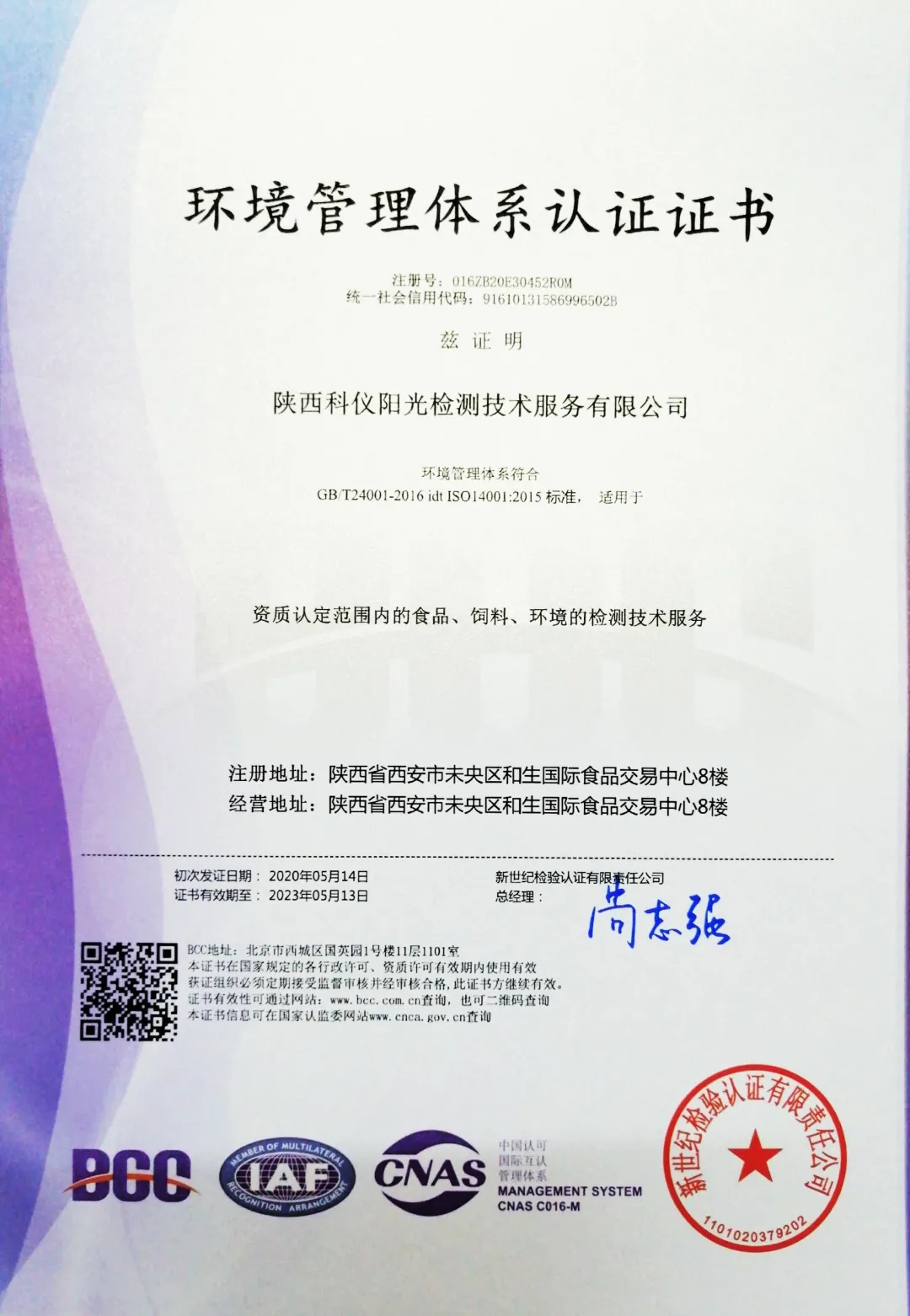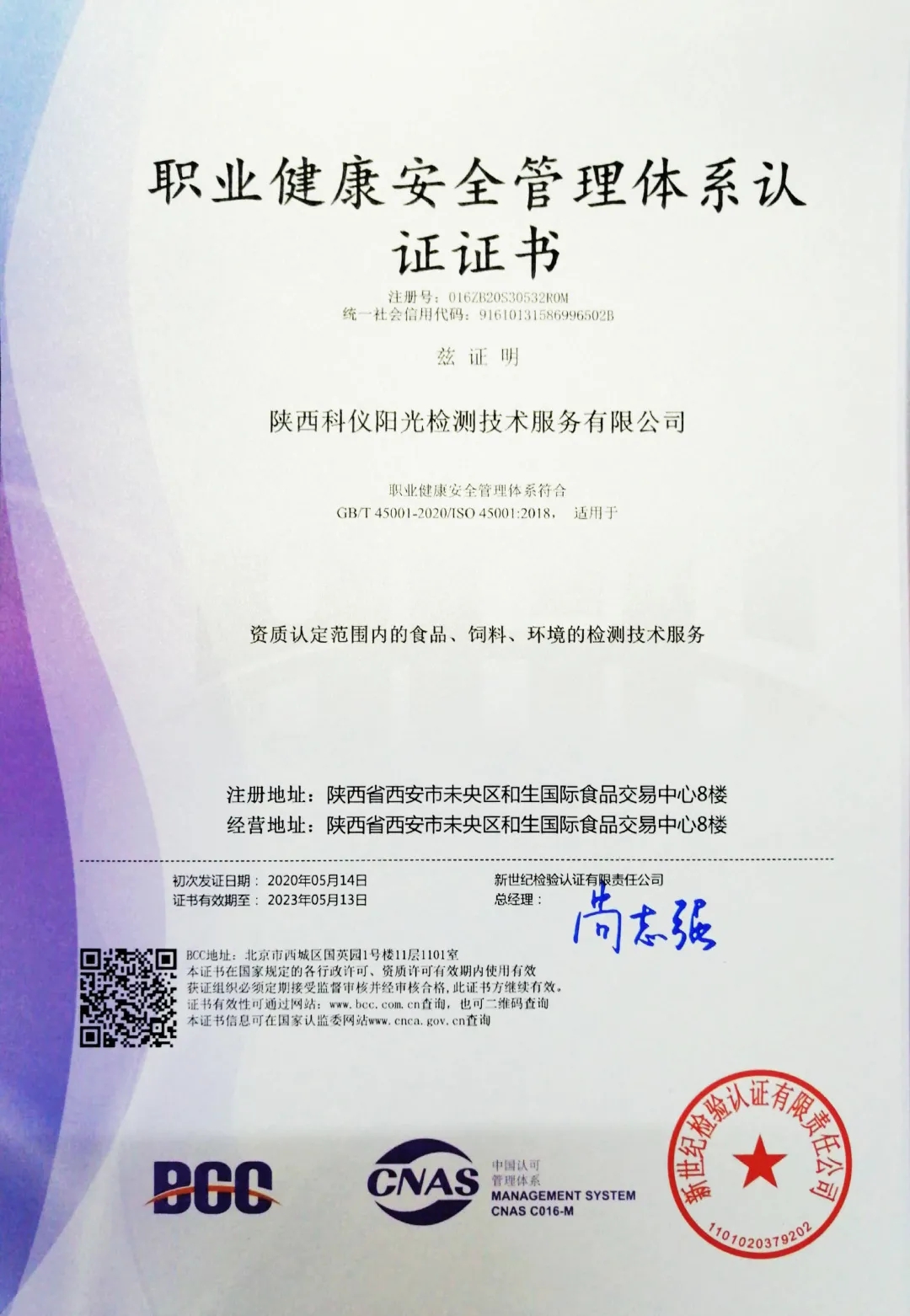 热烈祝贺陕西科仪阳光检测技术服务有限公司5月14日顺利通过ISO14001环境管理体系认证及ISO45001职业安全健康管理体系认证,并获颁证书,这是我司继获得ISO9001质量管理体系认证证书之后,又获得的两个管理体系认证证书,标志着科仪阳光检测“三标一体”体系认证工作全部完成。