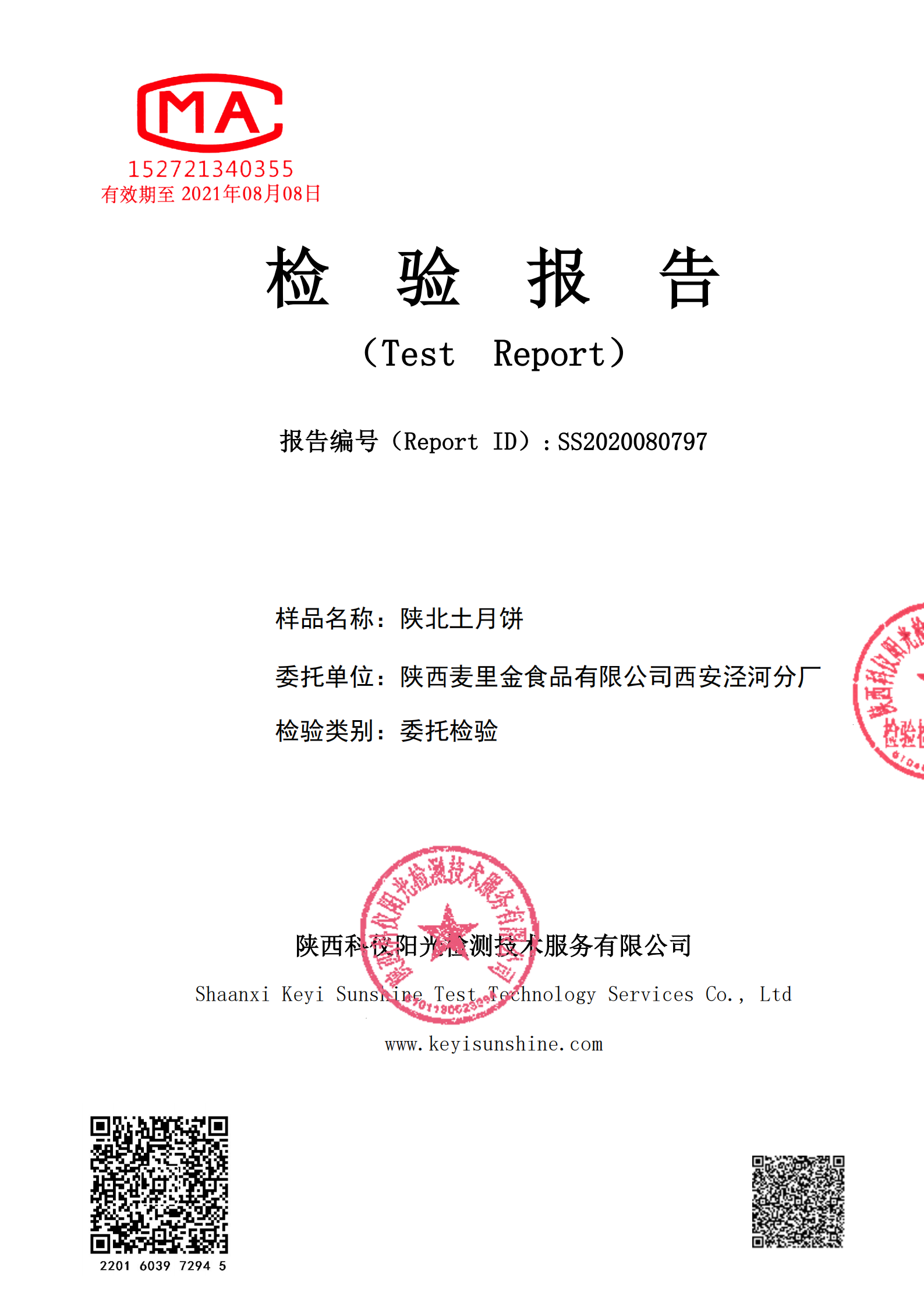 经过科仪阳光检测实验室严格的项目检测,最终结果报告显示,麦里金本次送检的包括陕北土月饼在内的52种产品均在合格范围之内。