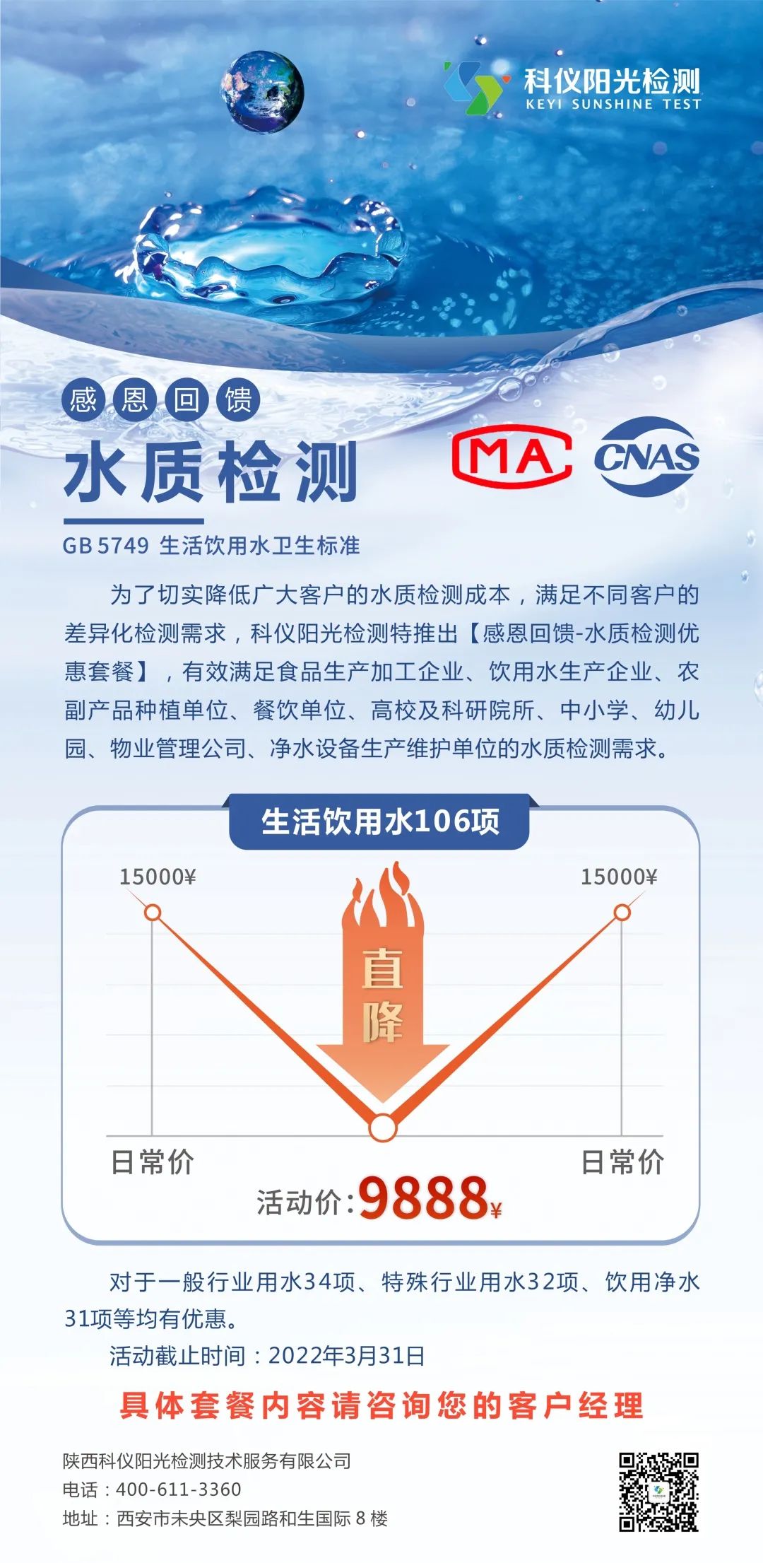 科仪阳光检测感恩回馈广大客户,特别推出“水质检测106项套餐优惠活动”,为您提供全面的水质检测方案,帮助企业降低水质检测成本,有效保障产品的质量和安全!