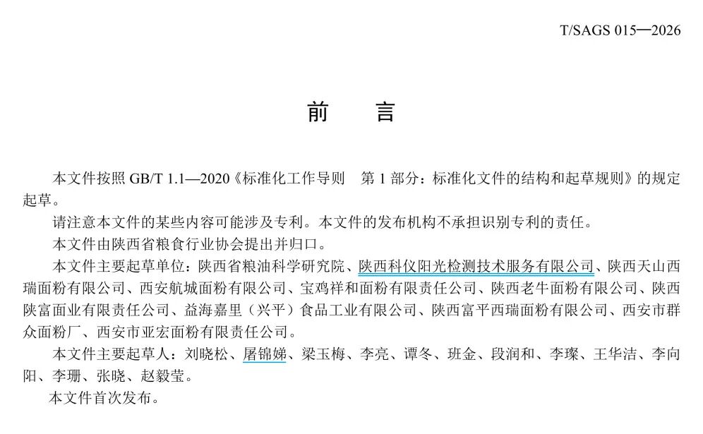 由陕西科仪阳光检测技术服务有限公司深度参与制定的陕西省粮食行业协会团体标准 T/SAGS015—2026《雪花小麦粉》,于2026年02月06日正式发布并开始实施。